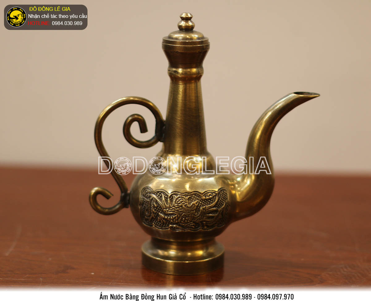 Ấm nước thờ hun giả cổ bằng đồng là sản phẩm được nghệ nhân Lê Gia áp dụng quy cách đúc công nghệ, làm màu hun giả cổ trên chất liệu đồng vàng. Ấm đồng hay bình đựng rượu, nước đi cùng bộ khay chén bằng đồng sử dụng trong thờ cúng gia tiên.