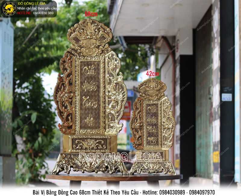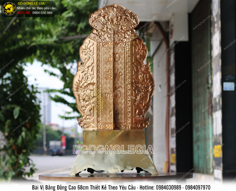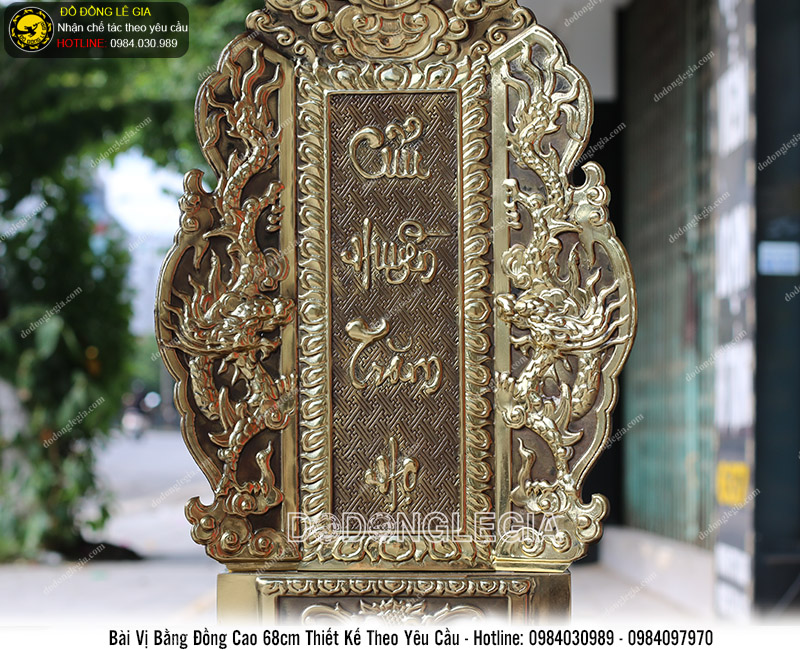 Trong văn hóa tâm linh thờ cúng, ngoài ảnh thờ những người đã khuất thì bài vị chính là vật lưu giữ tất cả thông tin của người đó. Bài vị là một vật có liên quan và giúp họ dễ dàng tìm đường trở về nhà, thăm lại con cháu. Hoặc đơn giản, thông qua bài vị, con cháu thể hiện những niềm mong ước, gửi lời cầu xin tới ông bà tổ tiên. Mẫu bài vị đây được làm bằng đồng tấm dày 8 rem thúc hoa văn nổi với chiều cao 42cm, 68cm hoặc theo yêu cầu của quý khách. Màu bài vị được làm màu giả cổ và phủ bóng 2k cho độ bền với thời gian trong quá trình sử dụng.