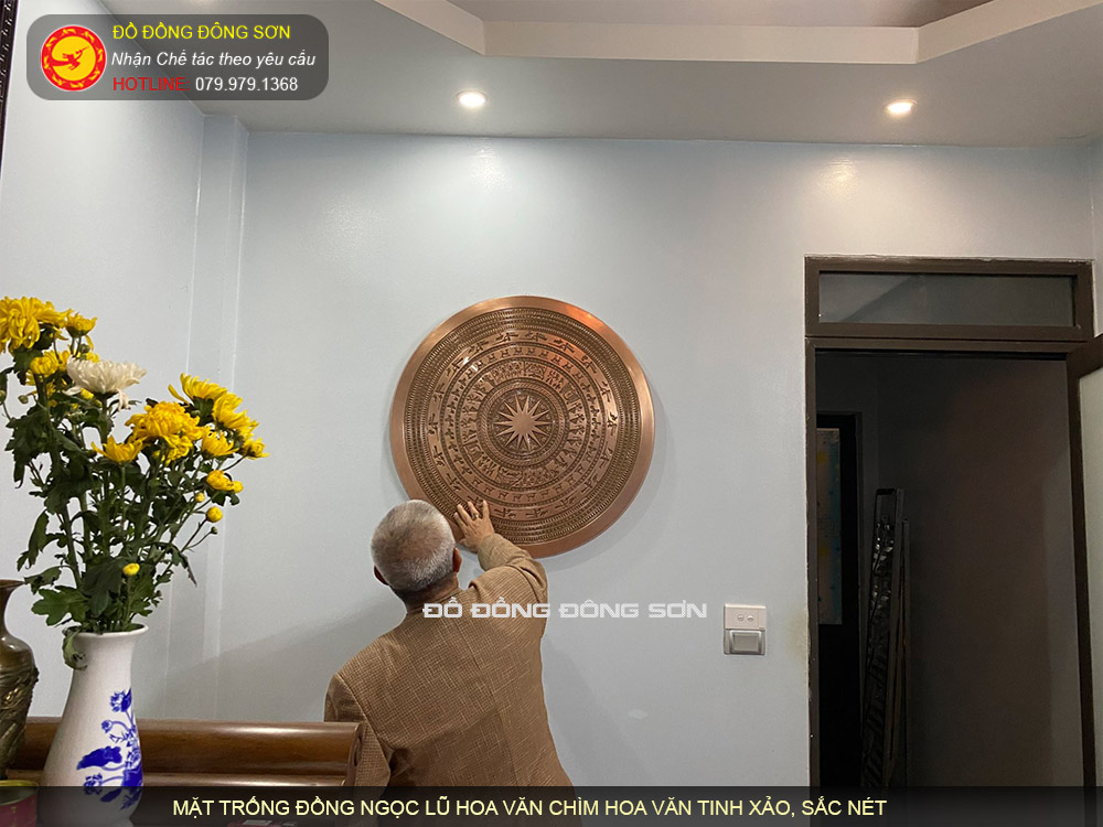 Mặt trống đồng hoa văn chìm trang trí phòng tiếp khách