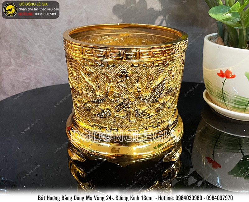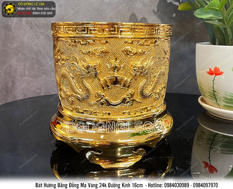 Bát hương đường kính 16cm bằng đồng mạ vàng 24K không chỉ là vật phẩm thờ cúng thông thường, mà còn là kết tinh của nghệ thuật thủ công và lòng thành kính. Hãy để Lê Gia đồng hành cùng quý khách trong hành trình giữ gìn nếp xưa – nâng niu đạo lý “Uống nước nhớ nguồn”.