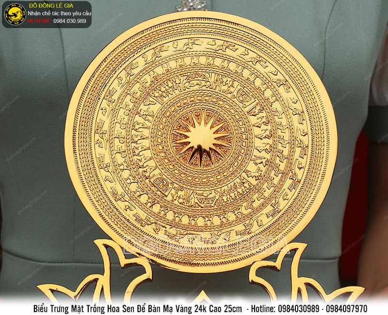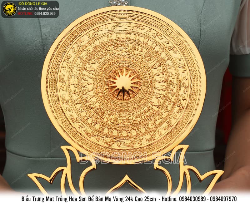 | Tên sản phẩm: | Biểu Trưng Mặt Trống Hoa Sen để bàn mạ vàng 24k cao 25cm |
