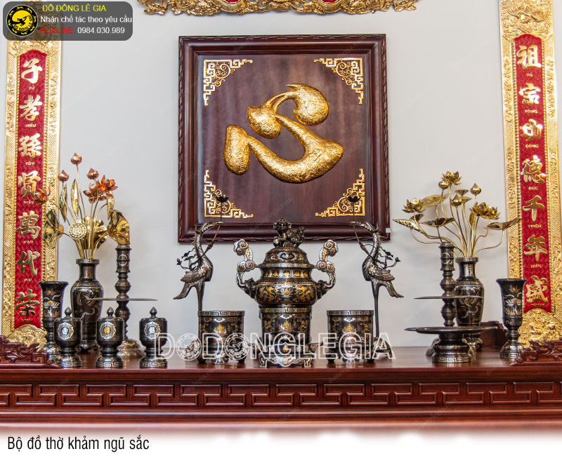 | Tên sản phẩm: | Bộ đồ thờ bằng đồng đỏ khảm ngũ sắc (Kích thước theo yêu cầu) |