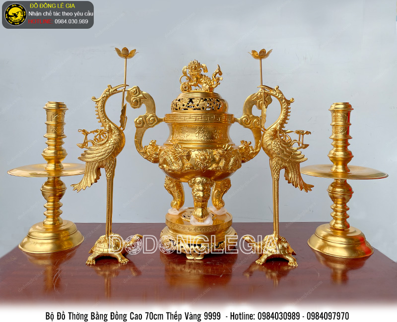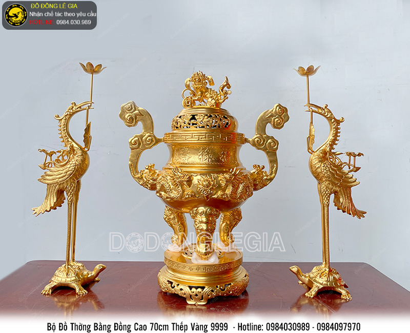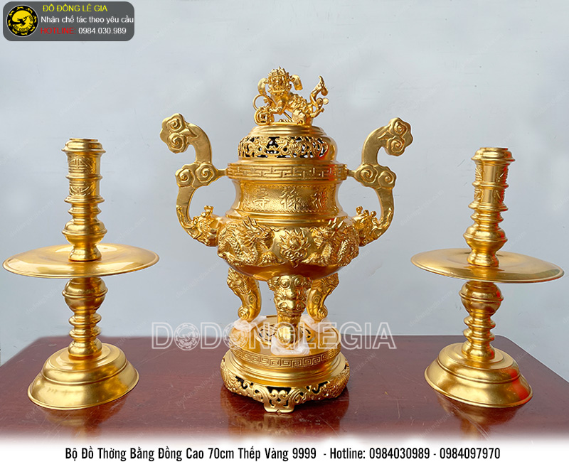 Bộ Đồ Thờ Bằng Đồng Dát Vàng 9999 Cao Cấp là bộ sản phẩm có giá trị rất lớn vì trọn bộ sản phẩm được dát vàng 9999. Bộ sản phẩm được chế tác bởi đồ đồng Đông Sơn theo đơn đặt hàng.