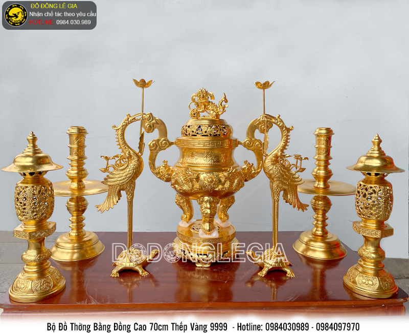 Bộ Đồ Thờ Bằng Đồng Dát Vàng 9999 Cao Cấp được chọn cúng tiến đình chùa, đền miếu. Do những giá trị tâm linh tốt mà nó mang lại, hơn nữa là thể hiện lòng thành của gia chủ.