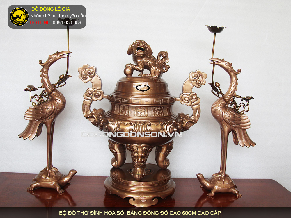 Bộ đồ thờ đỉnh hoa sòi cao 60cm có bộ Ngũ sự( 01 đỉnh + 02 chân nến + 02 hạc) và tam sự ( 01 đỉnh + 02 chân nến hoặc 01 đỉnh + 02 hạc).Quý khách có thể tham khảo và đặt hàng theo yêu cầu bộ Ngũ sự hoặc tam sự: