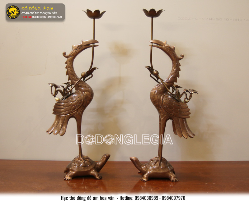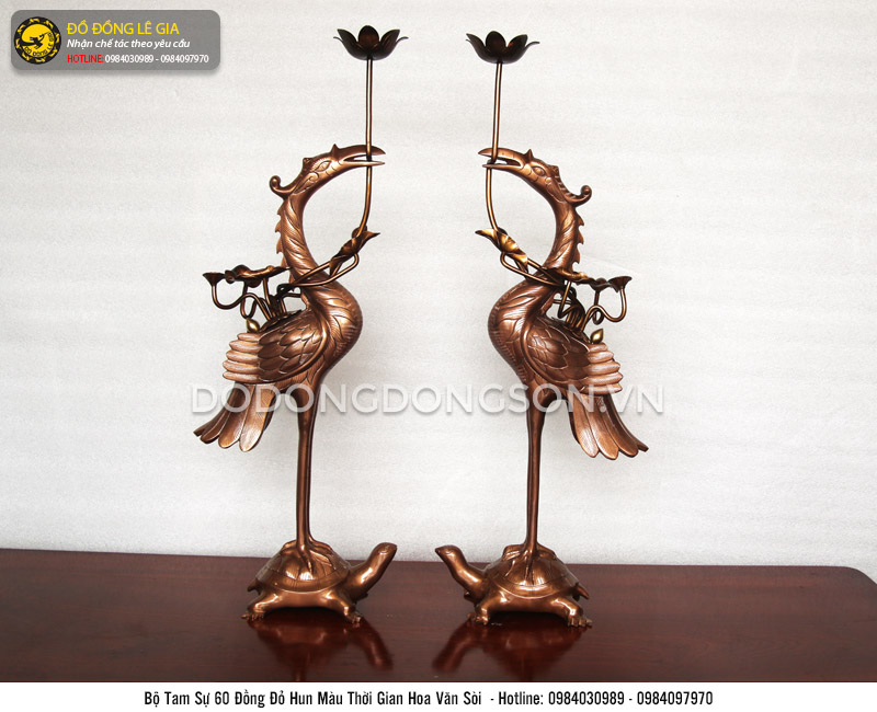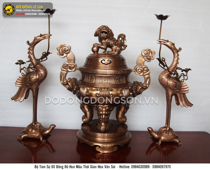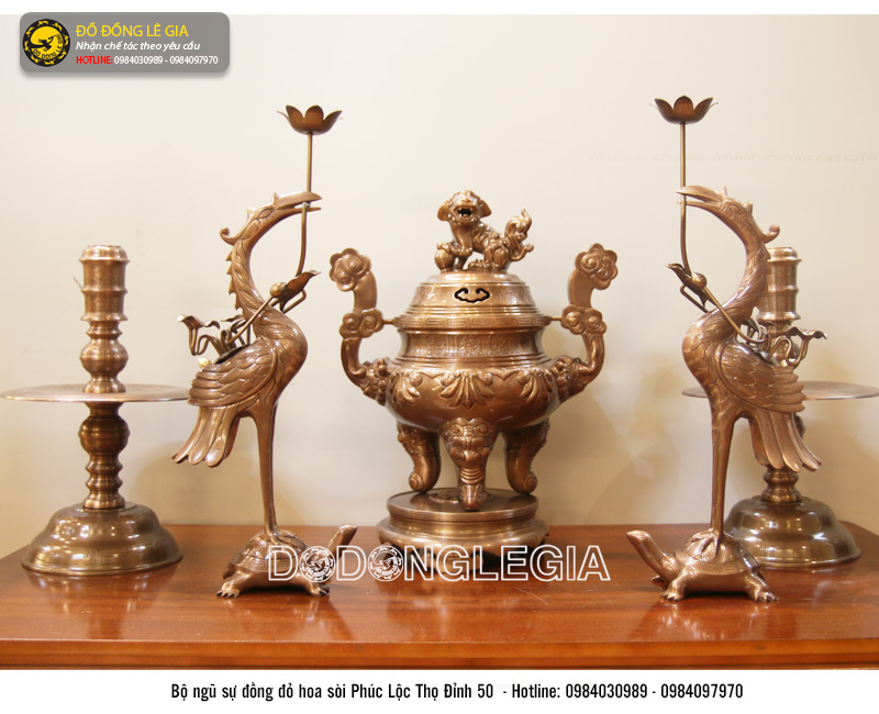 Bộ ngũ sự đỉnh đục Rồng Phượng bằng đồng đỏ hạ màu thời gian được chế tác và gia công tinh xảo tại xưởng Đúc Đồng Lê Gia, thiết kế cho bàn thờ từ 1m55 tới 1m97cm. Sản phẩm gồm 1 đỉnh đồng, kết hợp cùng đôi hạc và đôi chân nến.