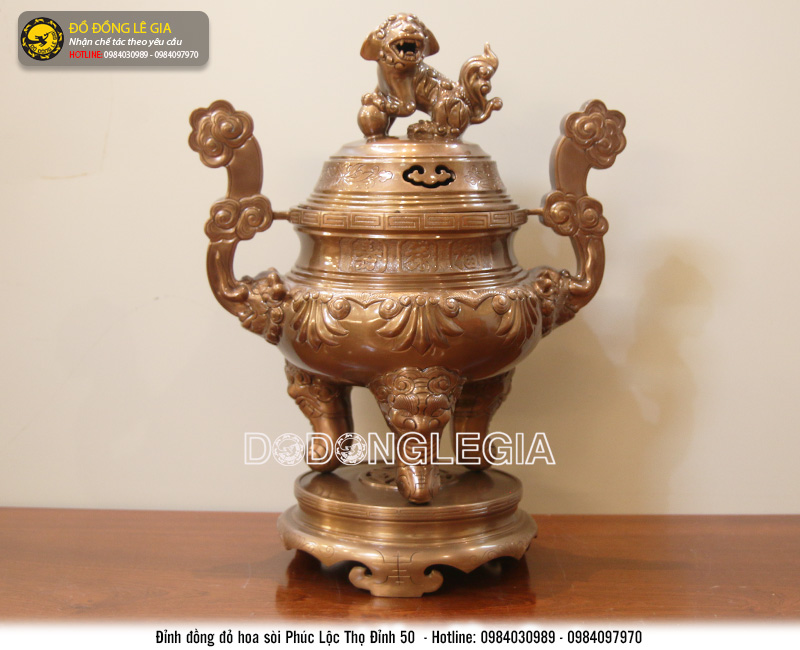 Sản phẩm được chúng tôi chế tác đúc hoàn thiện bằng phương pháp thủ công, đúc tay 100%. Sử dụng chất liệu đồng đỏ thanh khiết. Bề mặt được xử lý gia công kỹ càng, hạ màu trầm cổ theo thời gian. Mang tới những nét đặc trưng riêng biệt. Mẫu đỉnh được chúng tôi thiết kế đúc theo mẫu hoa sòi khắc Phúc - Lộc - Thọ rất đẹp và độc đáo.