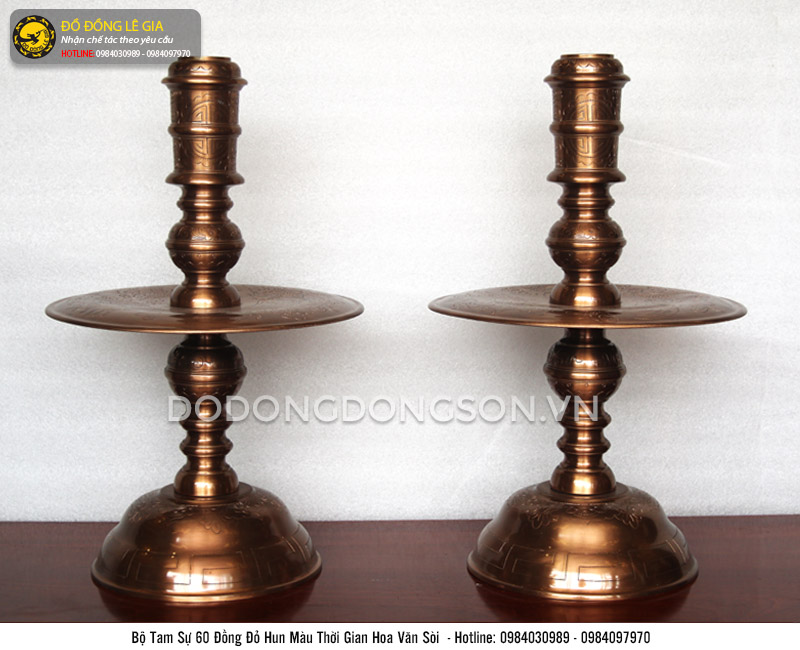 | Tên sản phẩm: | Bộ đồ thờ đồng đỏ ám hoa văn đỉnh cao 50 cm |