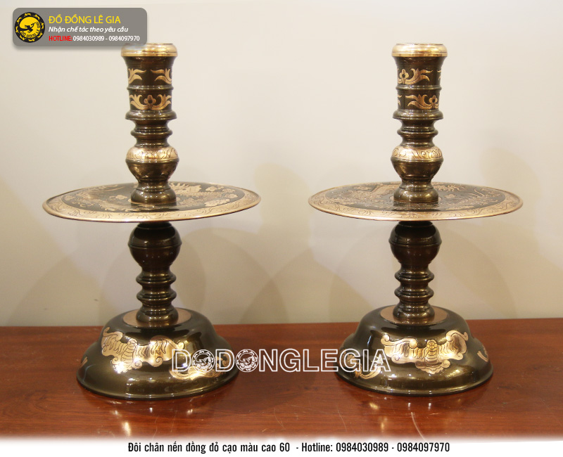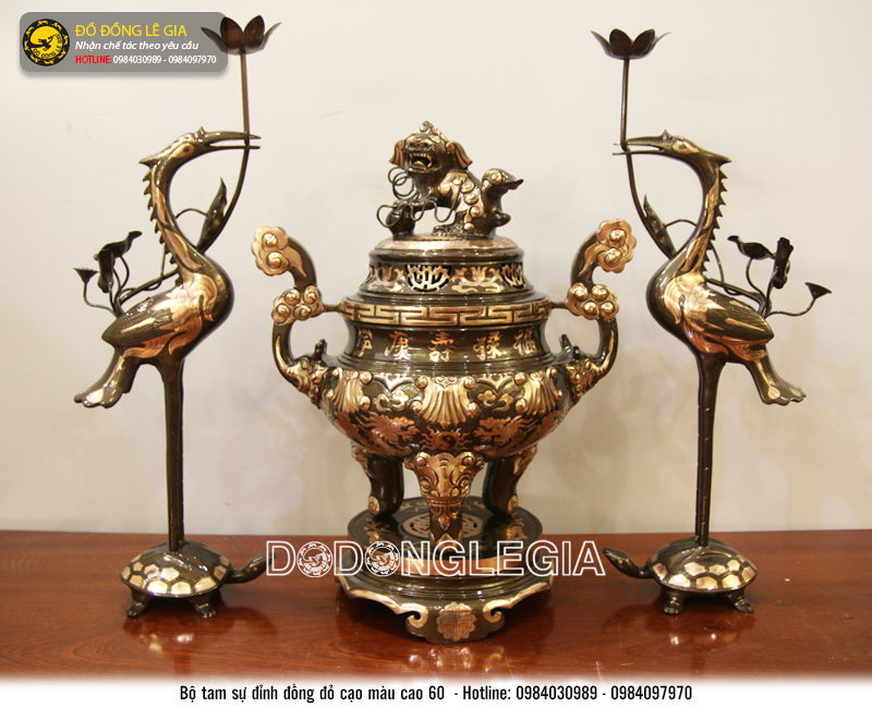 | Phù hợp ban thờ | Bộ đồ thờ bằng đồng đồng đỏ cạo màu 60cm là bộ sản phẩm cao cấp, được thiết kế với mẫu đỉnh cách điệu, sử dụng phù hợp cho bàn thờ cỡ 1m76 trở lên. |