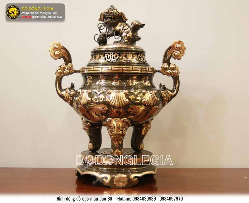 Bộ ngũ sự Đỉnh đồng đỏ cạo màu cao 60cm với trọng lượng đỉnh nặng khoảng 25kg phù hợp bàn thờ kích thước 1m76 trở lên, đỉnh đúc từ đồng đỏ thanh khiết, làm màu nền rêu cổ hơi xanh, ám hoa văn chữ triện "Phúc Lộc Thọ Khang Ninh".