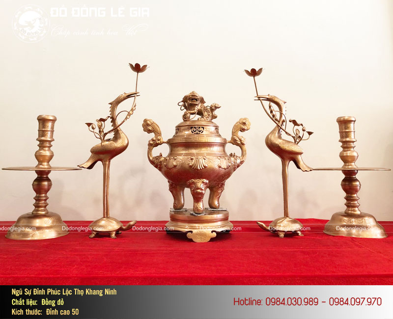 Bộ sản phẩm được đúc từ chất liệu đồng cao cấp nguyên khối nên sở hữu độ bền vĩnh cửu, hoàn toàn không bị đổi màu hay biến dạng trong trong quá trình sử dụng và di chuyển. Kích thước của bộ ngũ sự cũng được Lê Gia chế tác linh hoạt để phù hợp với diện tích ban thờ của mọi gia đình. Chắc chắn, đây sẽ là sự lựa chọn hàng đầu của mọi gia đình.