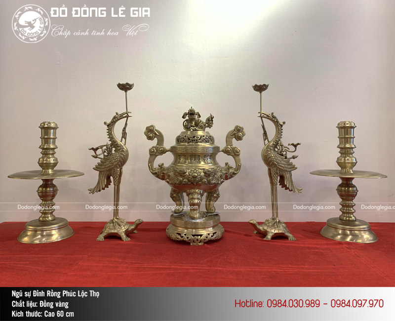 Đỉnh đồng: Là vật dùng để đốt trầm hương. Khi khói trầm hương lan toả sẽ tạo không gian thanh tịnh, đem lại cho con người cảm giác bình yên, tâm hồn được nhẹ nhõm. Đặc biệt, trên đỉnh đồng có tượng con nghề có ý nghĩa tạo sự uy nghi, tôn nghiêm, trấn áp tà ma, khí xấu. 3 chữ Phúc Lộc Thọ thể hiện mong muốn của gia chủ về cuộc sống bình an, hòa thuận.