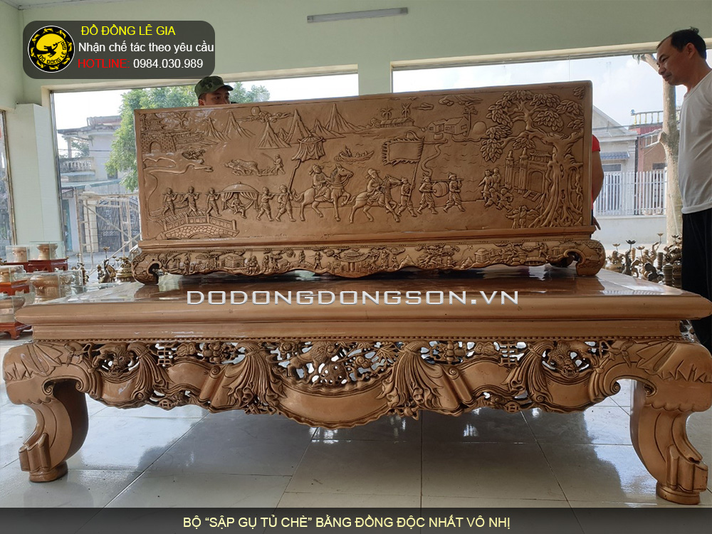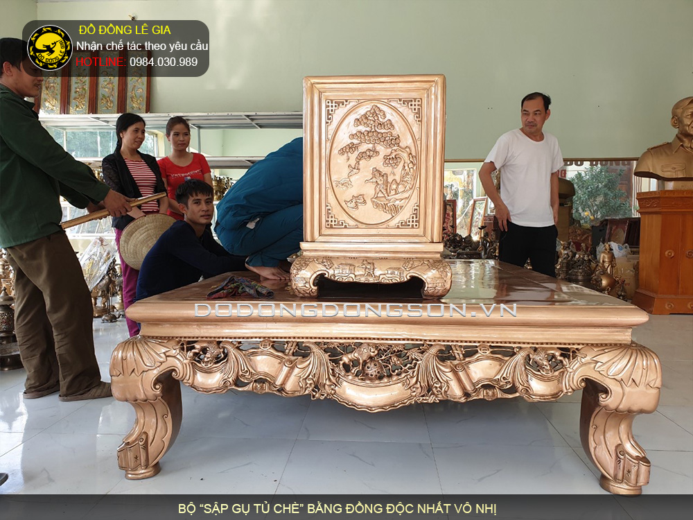 Bên cạnh đó, toàn bộ sản phẩm còn được đúc bằng đồng đỏ cao cấp với phương pháp đúc thủ công truyền thống khung đất. Thợ chế tác ở đây đều là những người được tuyển chọn, có kinh nghiệm lâu năm, có tâm huyết, khéo léo, tỉ mỉ, cẩn trọng. Thế nên bộ sản phẩm vô cùng sang trọng, bề thế, thể hiện đẳng cấp, sự cao sang, quyền quý của gia chủ. Bề mặt của bộ sập tủ chè được đánh bóng nhẵn nhụi, được khoác lên mình lớp áo màu vàng nhạt. Nên bộ sản phẩm không kém phần thanh thoát, nhã nhặn.