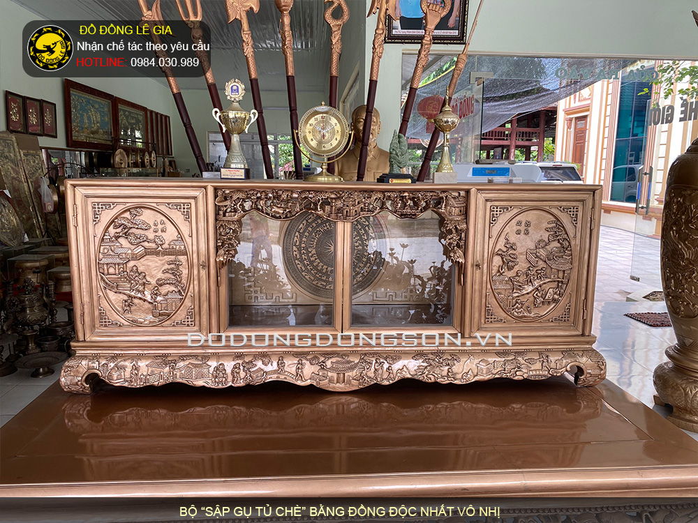 Bộ sập tủ chè đúc thủ công truyền thống bằng đồng đỏ nguyên chất là sản phẩm độc đáo có một không hai trên thị trường Việt Nam.