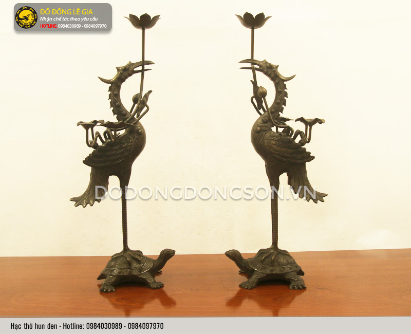Đôi hạc thờ: Là biểu tượng của sự trường thọ, sự thanh cao , tinh túy, đem lại may mắn, sức khoẻ dồi dào. Rùa là biểu tượng của sự trường tồn. Hạc đứng trên lưng rùa thể hiện cho lòng chung thủy, sự tương trợ lẫn nhau vượt qua khó khăn. Hay tạo lên sự liên kết tâm linh huyền bí, thể hiện mong ước gia đình luôn đoàn kết, giàu sang, thịnh vượng, các thành viên có sức khoẻ dồi dào, trường thọ.