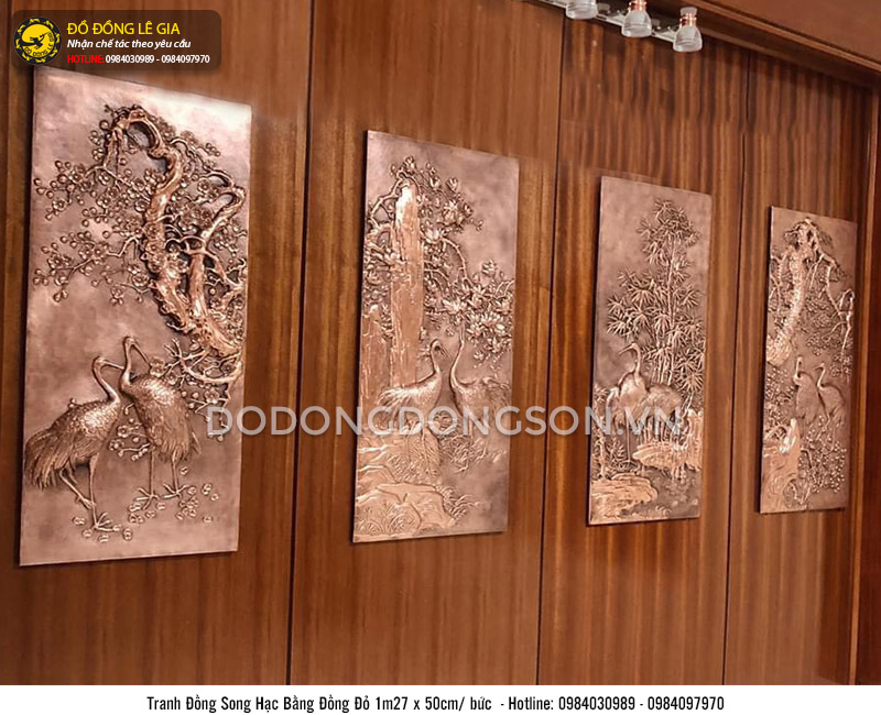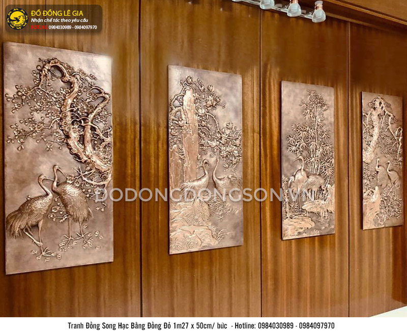 Bộ tranh song hạc bằng đồng đỏ có kích thước 127cm x 50cm, gồm 04 bức, thích hợp treo ở không gian phòng khách, phòng làm việc, công ty,… Hoặc sử dụng tranh làm quà tặng phong thủy cao cấp cho người thân, bạn bè, cấp trên trong các dịp lễ tết đặc biệt. Ngoài ra, khách hàng cũng có thể chọn lựa các mẫu tranh đồng khác như tranh chữ bằng đồng, tranh thuận buồm, tranh vinh quy,...