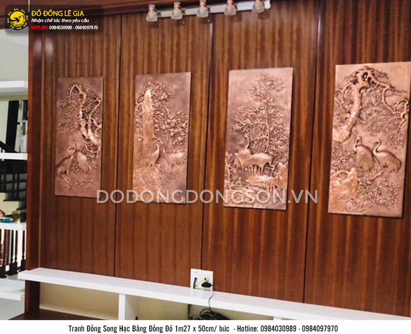 Bộ tranh song hạc bằng đồng đỏ của đồ đồng Lê Gia gồm 04 bức, được chạm hoàn toàn thủ công 100%, trực tiếp từ bàn tay của những nghệ nhân làng nghề. Tranh được chạm từ đồng đỏ liền nhập khẩu Hàn Quốc. Đồng dày tiêu chuẩn 8 rem, thuận tiện cho việc chế tác dễ dàng, không sợ thủng hay cong vênh. Tranh được lau màu giả cổ tạo nên màu sắc sang trọng, độc đáo và bền đẹp theo thời gian.