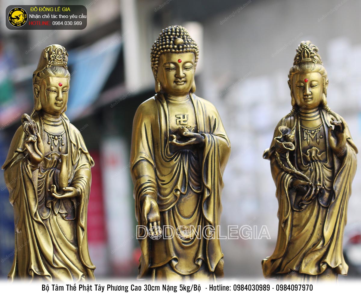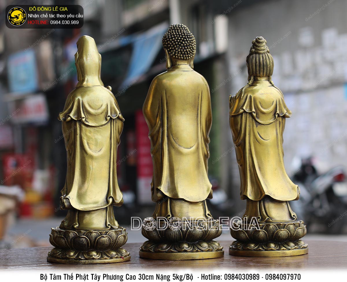 Sản phẩm bộ tượng đồng Tâm Thế Phật Tây Phương được đúc bằng đồng vàng thau. Đúc công nghệ với những đường nét hoa văn tinh xảo, sắc nét.