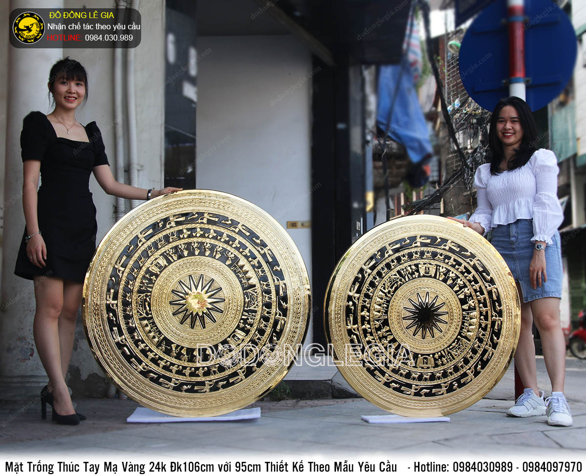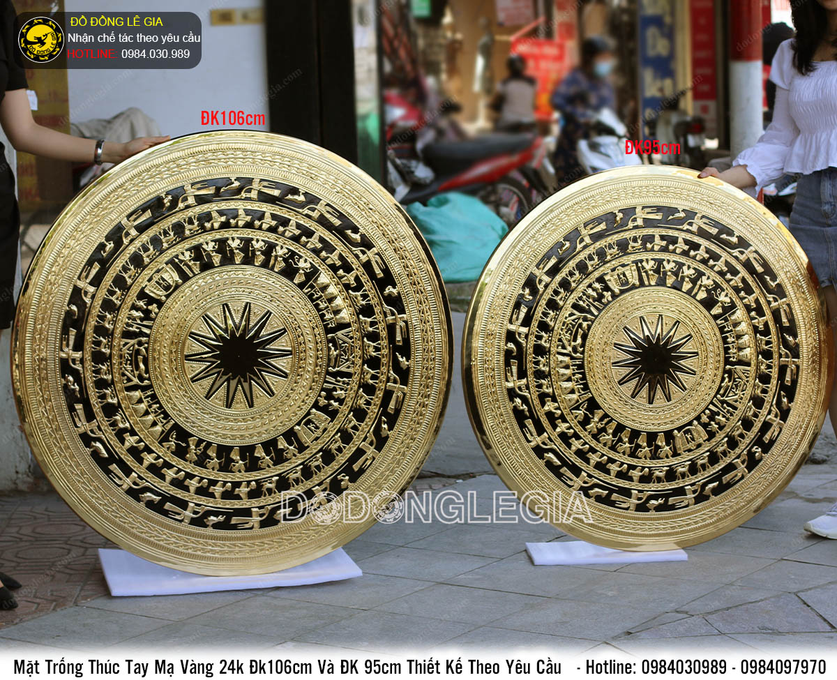 Mặt trống gò đồng vàng có đầy đủ các kích cỡ với đường kính 50cm, 60cm, 80cm, 1m, 1m07, 1m2, 1m27, 1m33,...... tùy theo không gian và nhu cầu.