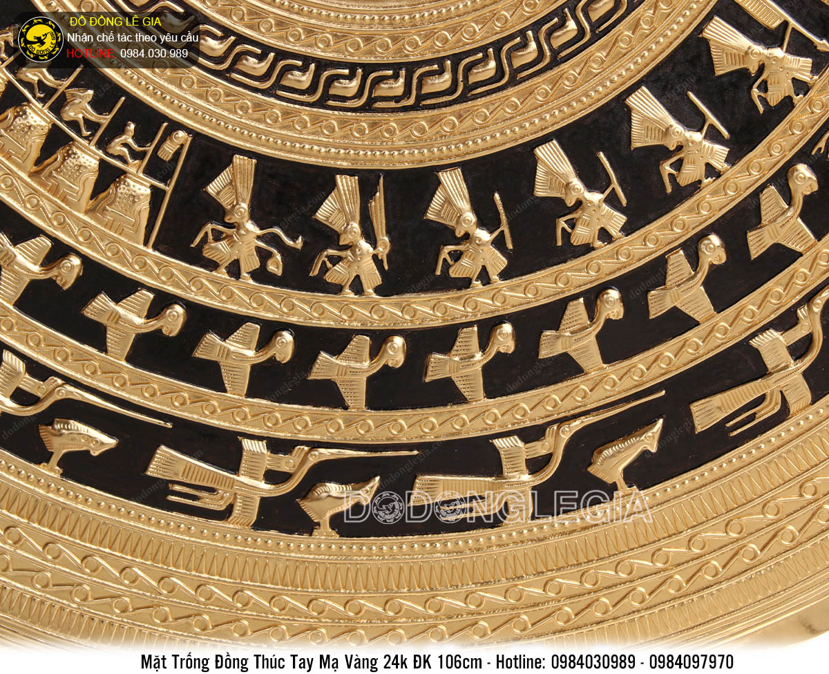 Bước đầu, người thợ sẽ tiến hành dán bản giấy phác thảo mặt trống lên tấm đồng. Sau đó, gò theo đường nét lên hoa văn mặt trống. Công đoạn đòi hỏi sự tỉ mỉ và khéo léo để khi thúc lên các đường nét nổi đều và tinh xảo. Tiếp đó, mặt trống được đem đi mài trơn bề mặt. Bước cuối cùng là tiến hành mạ phủ vàng ròng 24k bằng phương pháp điện phân nhúng bể cao cấp nhất hiện nay cho màu sắc đẹp và độ bền cao.