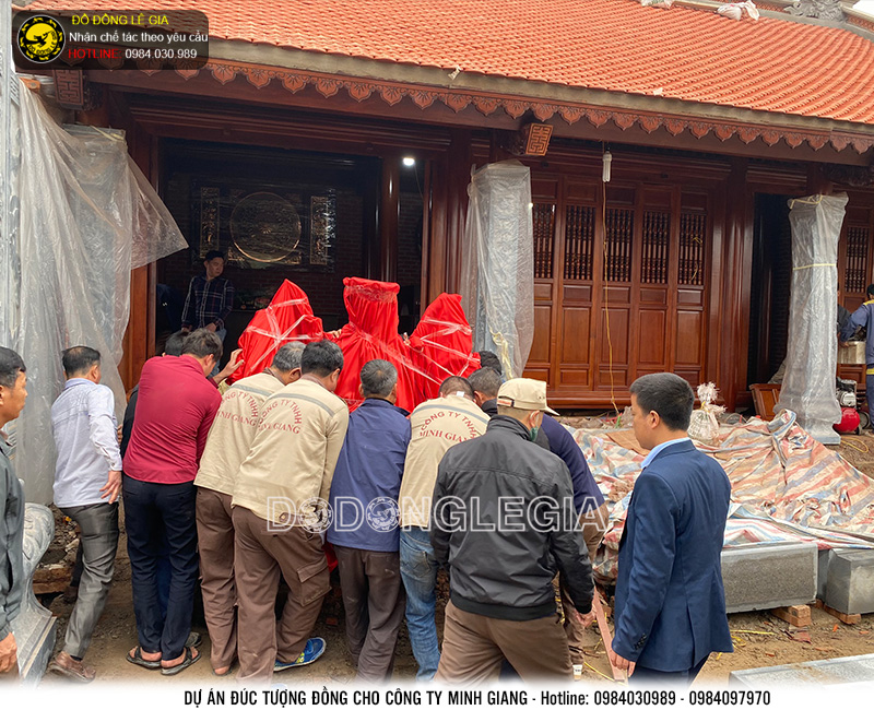 Tượng sau khi hoàn thành và được sự hài lòng của khách hàng, Đồ Đồng Lê Gia tiến hành vận chuyển tượng về an vị tại đền thờ tại Mê Linh.