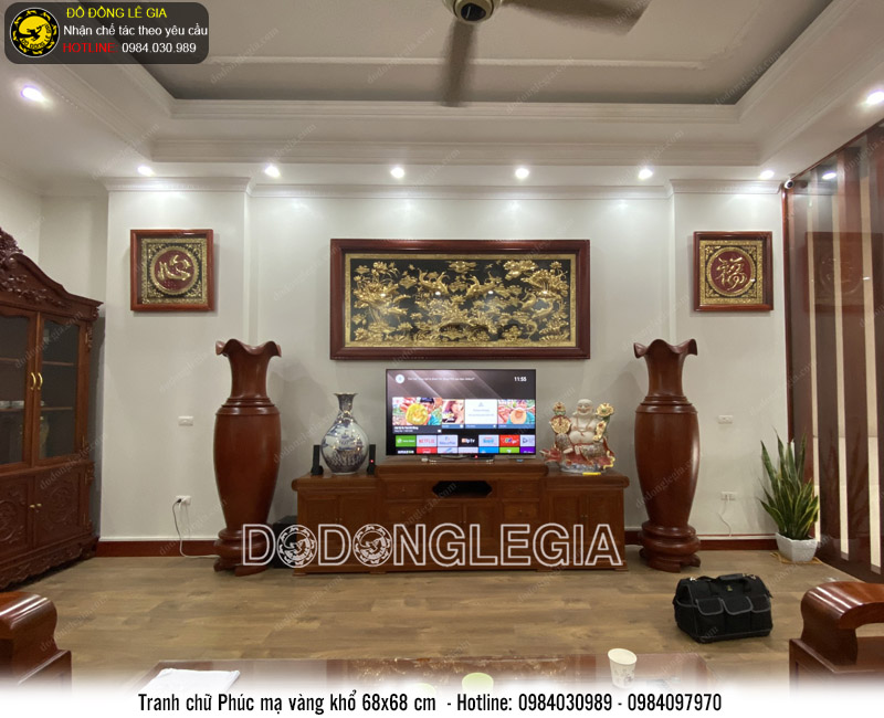 Bức tranh chữ Phúc Hán được gia chủ đặt theo yêu cầu cùng 2 bức tranh chữ Tâm và Tranh cửu ngư quần hội mạ vàng 24k cao cấp của Lê Gia