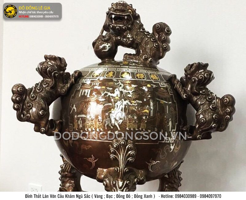 Đỉnh thất Lân vờn cầu bằng đồng khảm ngũ sắc
