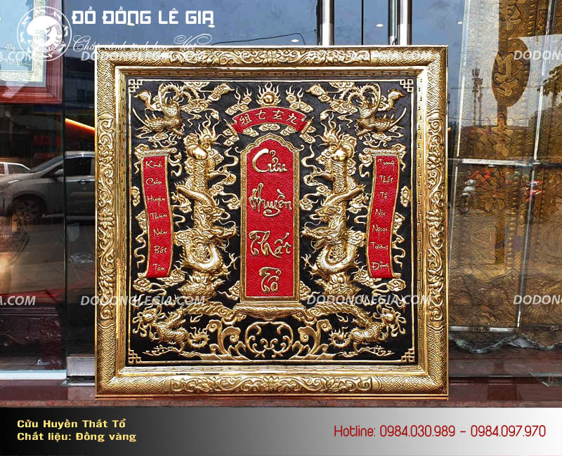 Được các nghệ nhân của Lê Gia chế tác từ chính đôi bàn tay khép léo, tỷ mỉ, cẩn thận trên tấm đồng cao cấp có độ dày tiêu chuẩn 8 rem. Toàn bộ các hoạ tiết trên sản phẩm được thúc nổi tỉ mỉ, rõ ràng, chính xác nên bức cửu huyển thất tổ có độ sắc nét và tính thẩm mỹ cực kỳ cao. Thêm vào đó là sự kết hợp màu sắc khéo léo, hài hoà của những tone màu tương phải đối lập là màu vàng tự nhiên của đồng, màu sơn đỏ, sơn đen. Từ đó toát lên sự cao quý, làm tăng thêm sự trang nghiêm cho không gian thờ tự.