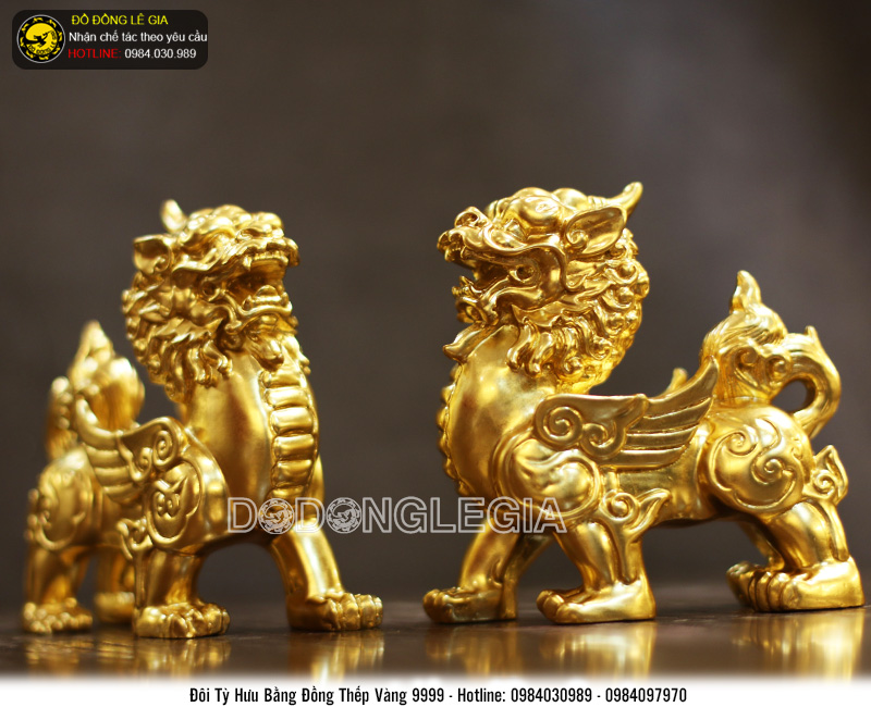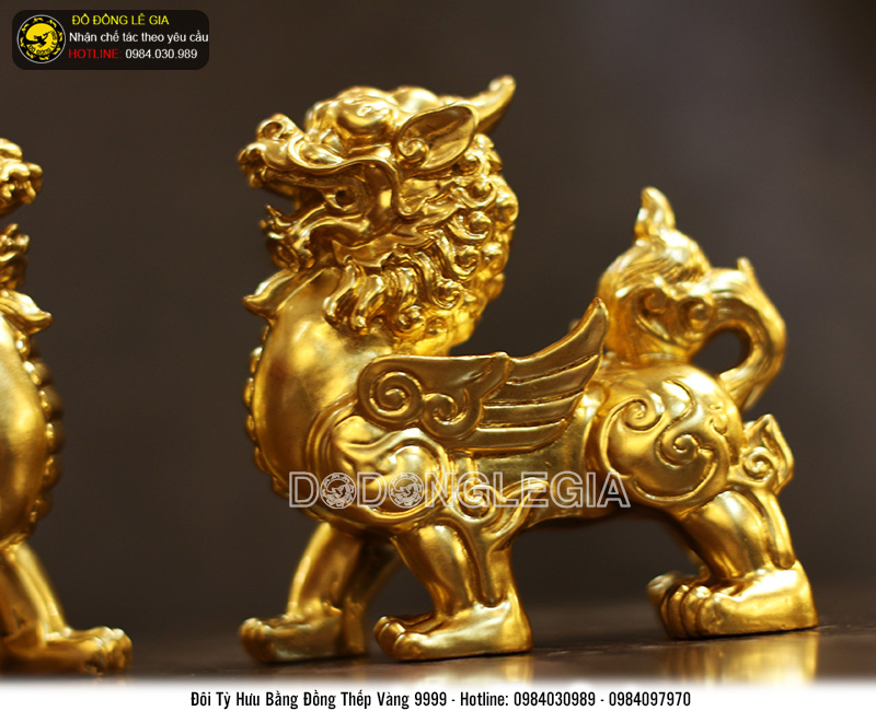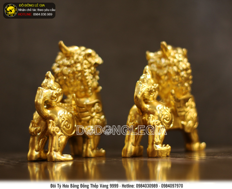 Đôi tỳ hưu được đúc hoàn toàn thủ công bằng tay từ nguyên liệu đồng vàng. Tượng Cao 11cm, dài 10cm, ngang 4.5cm. Sản phẩm sau khi đúc được chuyển sang đánh nhẵn bề mặt. Sau đó tiến hành dát vàng 9999 lên toàn bộ bề mặt sản phẩm. Với việc dát vàng này sẽ giúp cho sản phẩm thêm phần sang trọng, đẳng cấp và đặc biệt hơn là bề mặt sẽ không bị thay đổi theo thời gian.