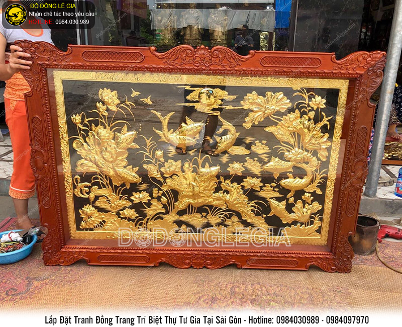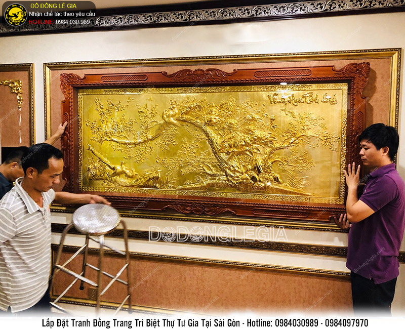 Mỗi bức tranh mang một ý nghĩa khác nhau, kích thước khác nhau, màu sắc khác nhau. Dự án chế tác tranh đồng mạ vàng cho biệt thự tư gia tại Sài Gòn được thực hiện trên chất liệu đồng vàng dày 8rem, mạ vàng 24k, Khung gỗ Hương. Tất cả các sản phẩm đều phải trải qua những công đoạn chế tác nếu trên, bằng bàn tay chạm của những người thợ thủ công, chạm tinh xảo đến từng chi tiết. Phù hợp để trang trí cho biệt thự, lâu đài.