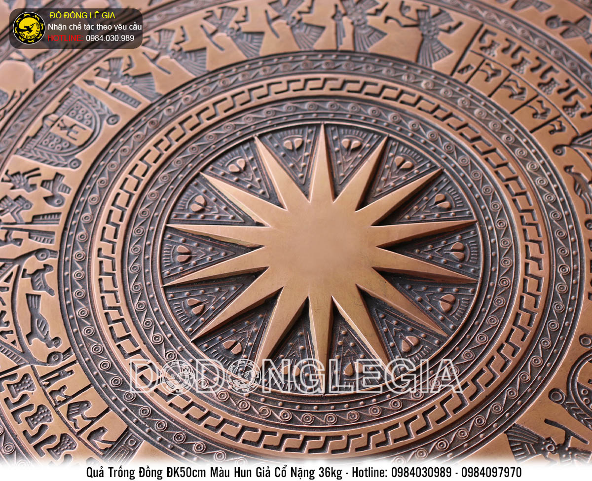 Mẫu trống đồng được nghệ nhân Lê Gia chế tác theo khuôn mẫu trống Đông Sơn. Với đặc điểm nổi bật là các đường nét hoa văn chìm tinh xảo. Tâm trống là hình ngôi sao 14 cánh, hình tượng của thiên nhiên- Mặt trời. Xen giữa các cánh sao là những họa tiết hình lông công. Tiếp đó là 16 vành hoa văn: chấm nhỏ, vòng tròn chấm giữa có tiếp tuyến, những hàng chữ ∫ gẫy khúc nối tiếp, văn răng cưa, hình người hóa trang lông chim nhảy múa, người giã gạo chày đôi, người đánh trống, nhà sàn mái cong, hươu đang đi cùng chim mỏ ngắn bay và chim mỏ dài đứng.