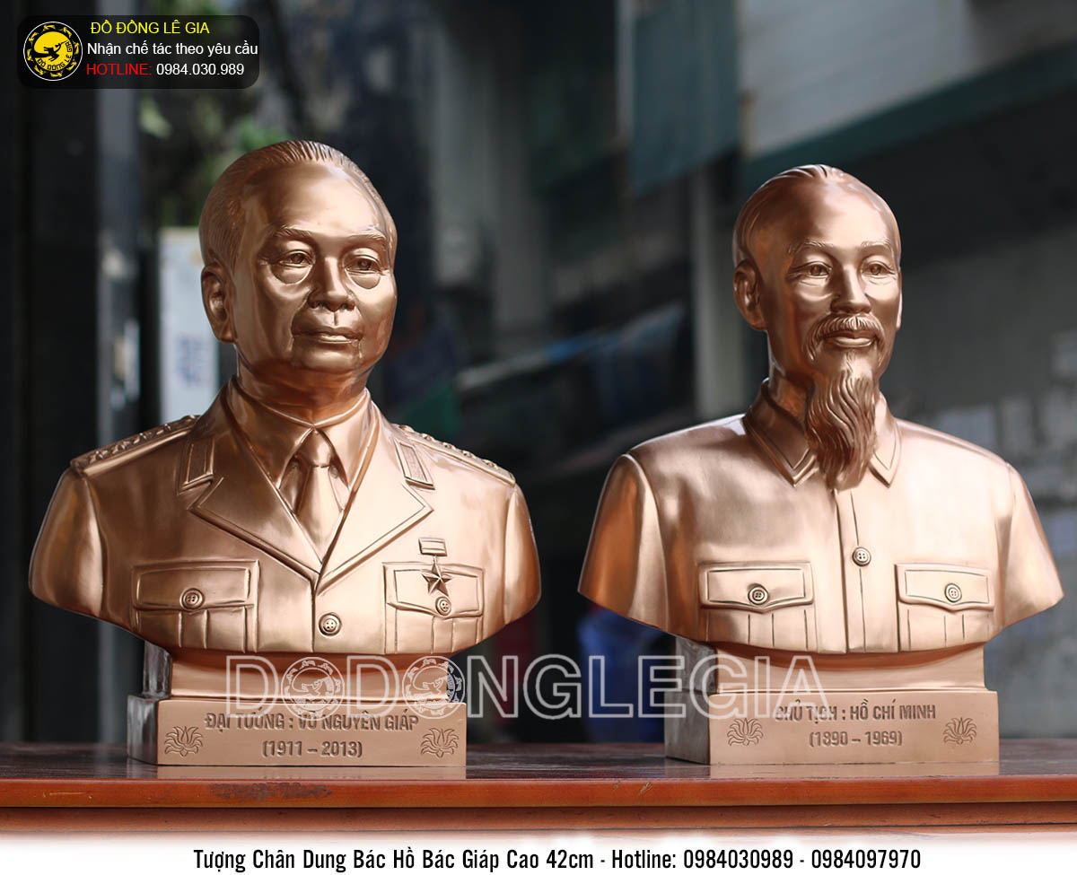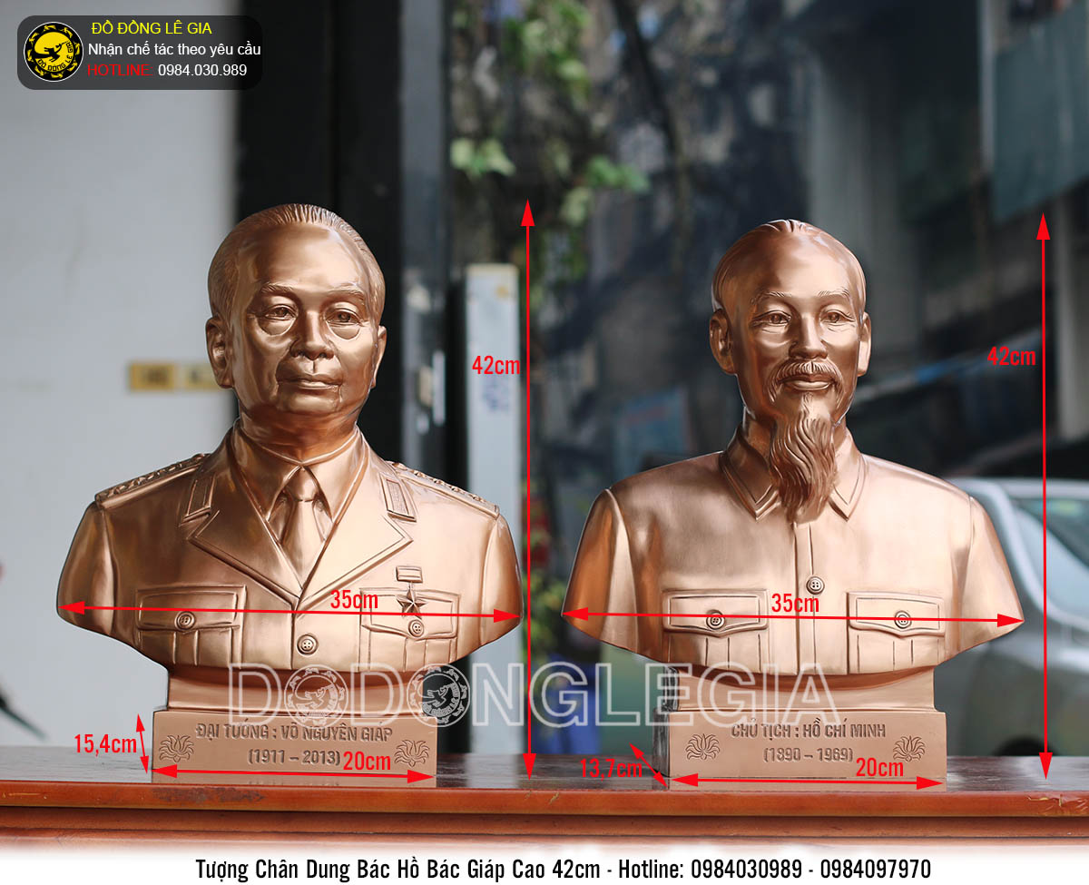 Mẫu tượng chân dung Bác Hồ- Bác Giáp được các nghệ nhân Lê Gia chế tác theo phương pháp thủ công truyền thống gồm 7 công đoạn chính, đảm bảo độ tinh xảo, bền bỉ của tượng sau khi hoàn thiện. Tượng Bác hoàn thiện giữ màu đồng đỏ mắt cua.