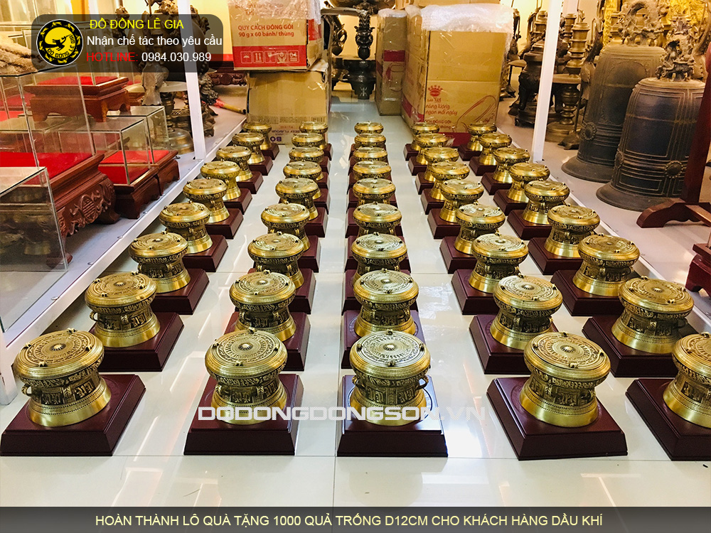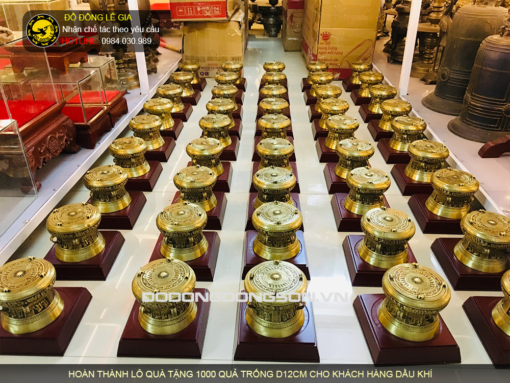1000 quả trống đồng quà tặng được chế tác theo yêu cầu để tặng khách hàng, đối tác trong sự kiện văn hoá, hội nghị cao cấp. Quả trống để bàn tạo sự sang trọng, tôn nghiêm, lại giàu ý nghĩa văn hoá, phong thuỷ.