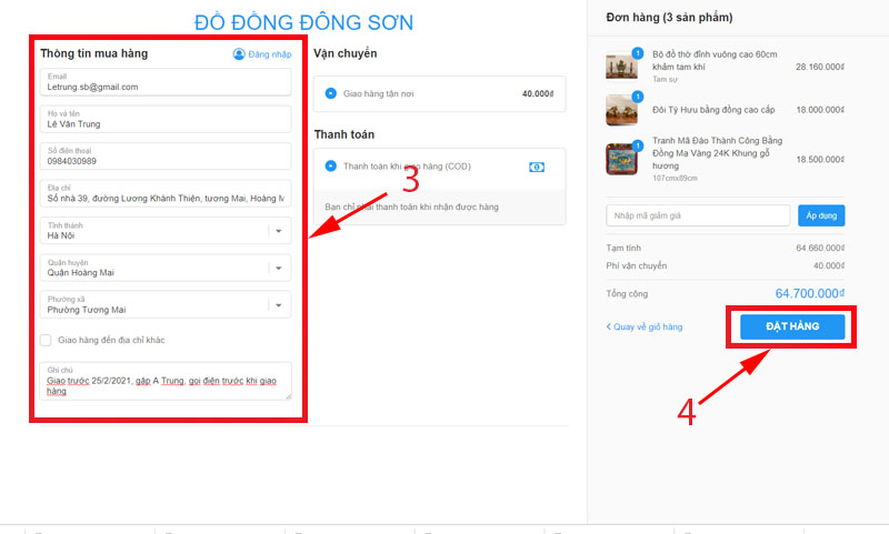 Bước 3: Quý khách nhập đầy đủ thông tin cho đơn hàng và tiến hành đặt hàng.