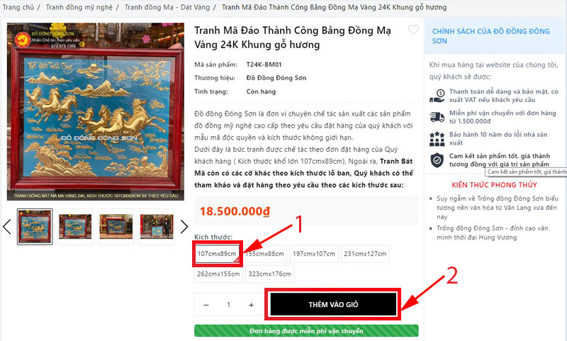 Bước 2: Sau khi đã lựa chọn được kích thước sản phẩm ưng ý, Quý khách click vào nút THÊM VÀO GIỎ HÀNG.