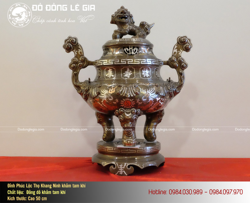 Đỉnh thờ khảm tam khí đồng đỏ