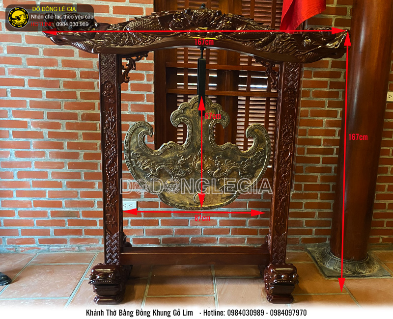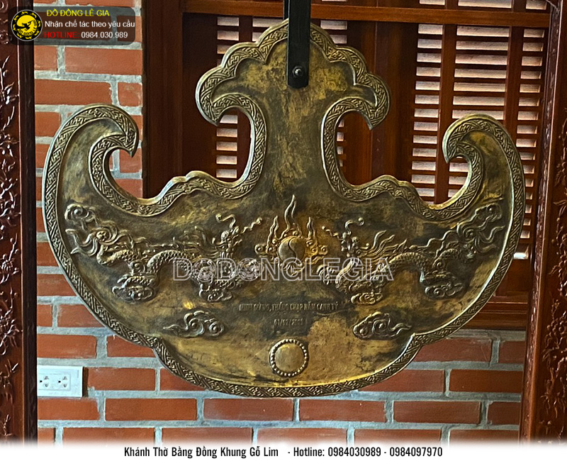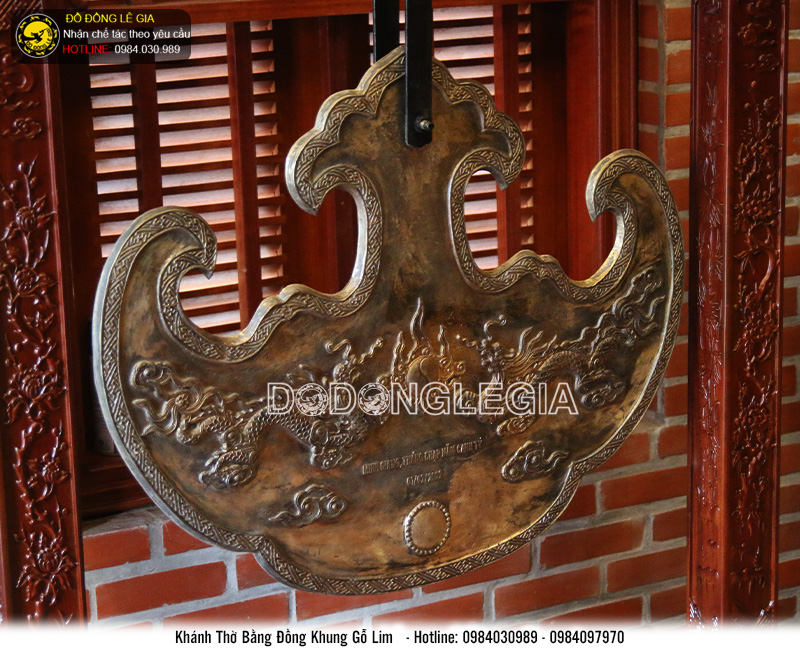 Khánh đồng là một trong những loại nhạc khí, thuộc bộ gõ, có âm thanh tương đối nhỏ chứ không vang như tiếng chuông chùa, hầu như chỉ người đứng rất gần mới có thể nghe thấy những âm thanh này. Trên khánh đồng người ta thường khắc hình ảnh rồng phượng, bài văn, khắc những chữ với những đường nét mềm mại, tinh tế. Khánh đồng giá gỗ lim là sản phẩm được các nghệ nhân của Lê Gia chế tác theo yêu cầu đặc biệt của khách hàng với phương pháp đúc thủ công. các đường nét trên sản phẩm được thúc tỉa tinh xảo. Chất liệu chính được sử dụng là Đồng đỏ cao cấp pha trộn cùng thiếc và phụ gia với tỉ lệ chuẩn để sản phẩm hoàn mỹ nhất. |