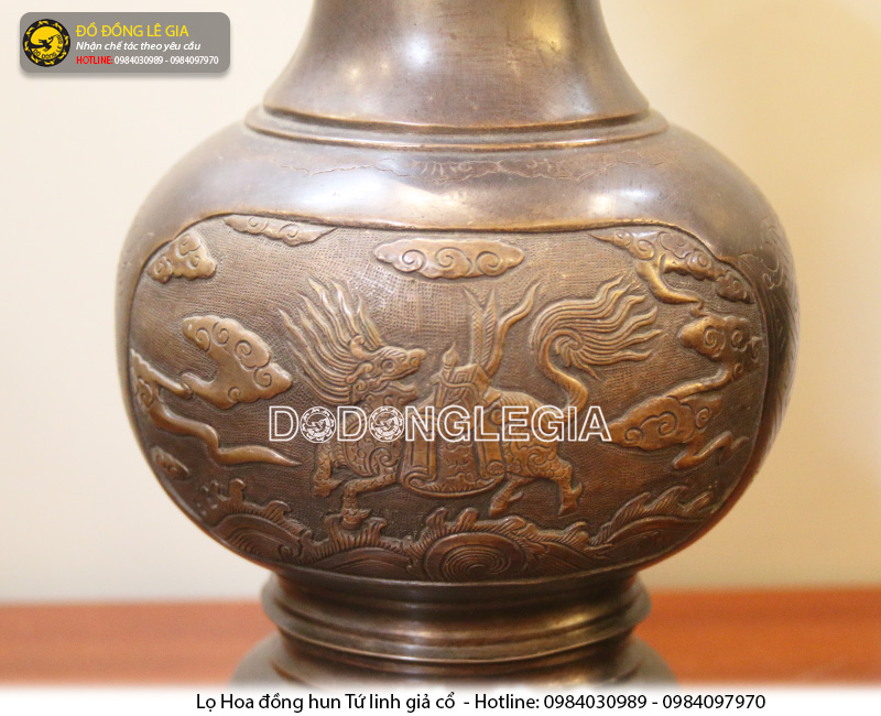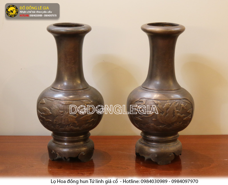 Bên cạnh chất liệu Đồng vàng phổ biến thì Lọ Hoa Tứ Linh bằng đồng đỏ cũng là một lựa chọn khác dành cho không gian thờ cúng của gia đình bạn. Mẫu lọ hoa tứ linh đồng đỏ này được hun nâu giả cổ. Kích thước lọ hoa cao 40cm, được đúc hoàn toàn thủ công, phù hợp với kích thước ban thờ dài khoảng 1m55 trở lên.