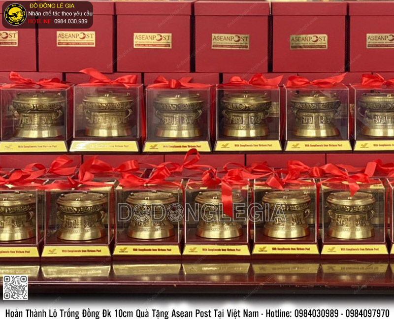 Lô trống đồng D10 đúc từ đồng vàng nguyên chất, họa tiết tinh xảo, đi kèm đế gỗ, hộp mica và hộp đựng cao cấp – món quà tặng ý nghĩa cho đối tác, doanh nghiệp trong các sự kiện lớn.
