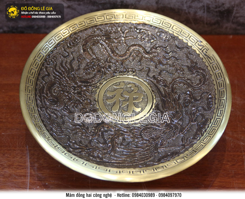 Mâm bồng chữ Lộc bằng đồng vàng mộc được chế tác từ đồng vàng nguyên chất nguyên khối với 2 phần là chân trụ vững chắc và phần mâm nồng có hình tròn võng xuống tạo nét mềm mại, cân đối, giúp bày đồ lễ dễ dàng. Mâm có màu vàng đồng tươi sáng, bề mặt được phủ bóng, lòng mâm được chạm hoa văn cầu kỳ, tinh xảo. Do đó chiếc mâm toát lên vẻ đẹp cao quý, sang trọng, tăng thêm sự trang nghiêm cho không gian thờ cúng.