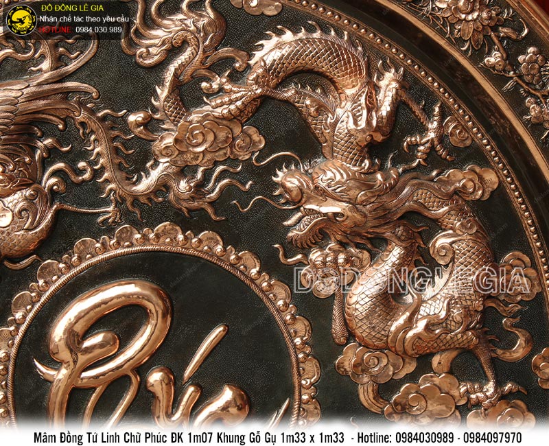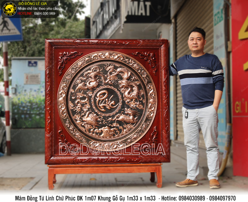 Mâm đồng chữ Phúc chạm Tứ Linh bằng đồng đỏ khung gỗ gụ KT 1m33 không chỉ là vật phẩm nghệ thuật trang trí, mà còn mang ý nghĩa sâu sắc về tâm linh và phong thủy. Đây là món quà ý nghĩa, một biểu tượng của hạnh phúc viên mãn và tài lộc bền lâu. Lựa chọn sản phẩm tại Lê Gia là chọn sự tinh hoa của nghề thủ công truyền thống Việt Nam.