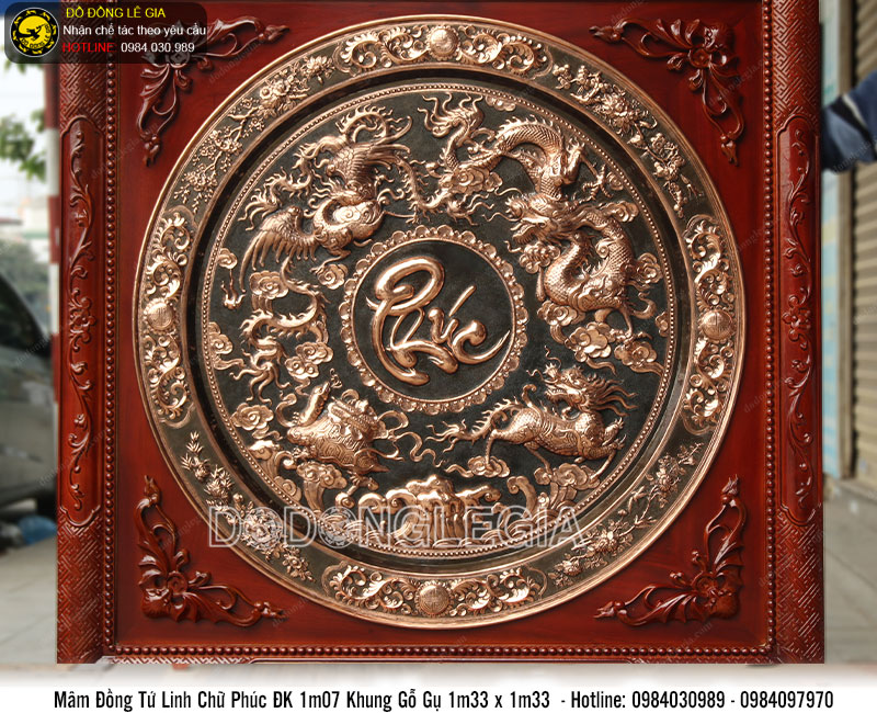 Mâm đồng chữ Phúc chạm tứ linh bằng đồng đỏ khung gỗ gụ KT 1m33 là tác phẩm nghệ thuật thủ công cao cấp, hội tụ giá trị thẩm mỹ và tâm linh sâu sắc, phù hợp để trưng bày, biếu tặng dịp quan trọng.