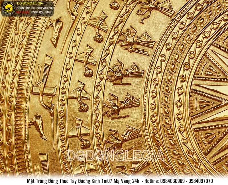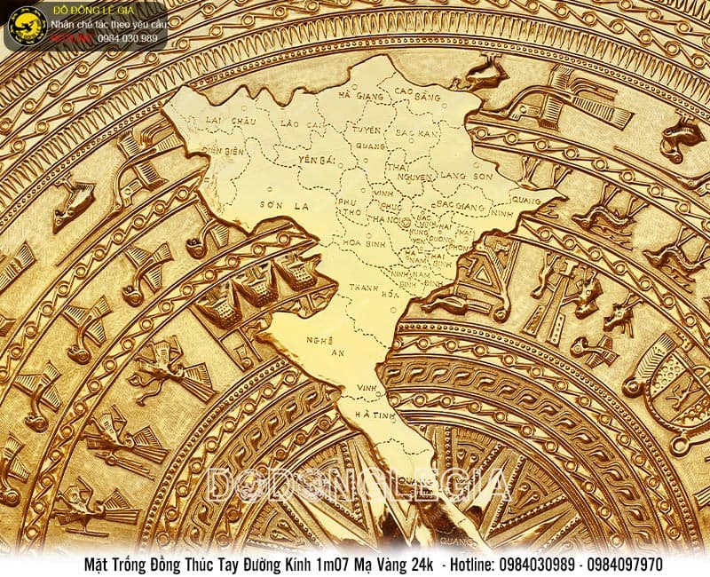 Mặt Trống Đồng thúc tay Bản Đồ mạ vàng 24k đường kính 1m07 là dòng sản phẩm cao cấp, chế tác hoàn toàn thủ công từ đồng vàng nguyên chất, sau đó được mạ một lớp vàng ròng 24K óng ánh, tạo nên vẻ ngoài sang trọng, bền bỉ với thời gian. Đây là sự kết hợp tinh tế giữa nghệ thuật chế tác truyền thống và giá trị lịch sử - văn hóa sâu sắc.