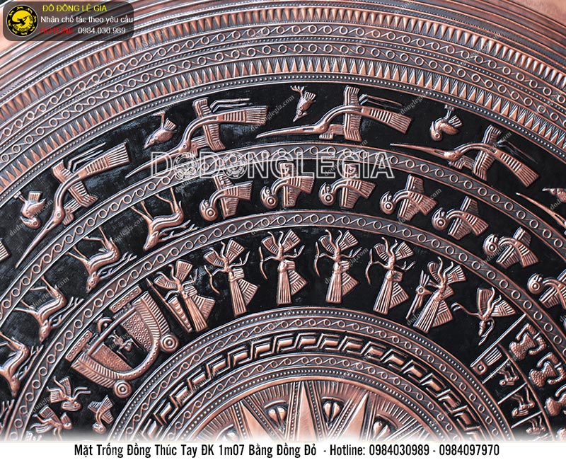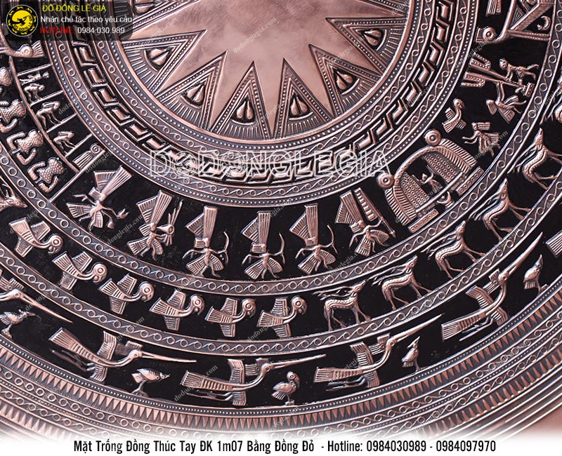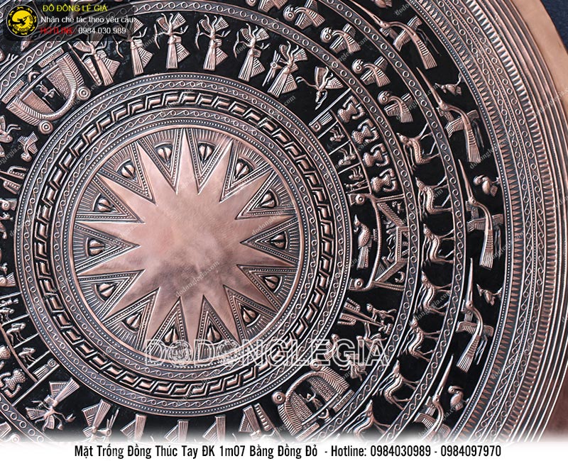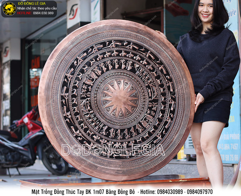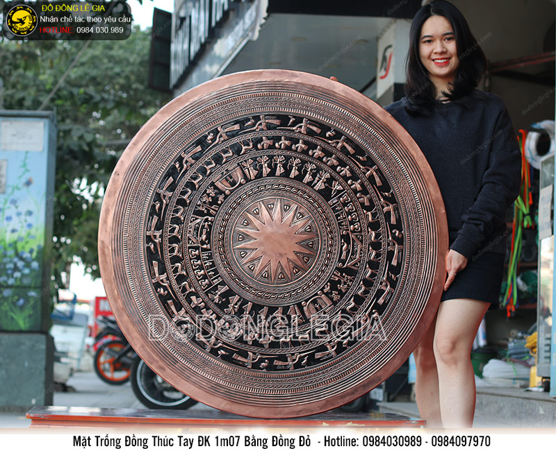 Mặt trống đồng là một trong những món đồ được trang trí cho ngôi nhà. Các hoa tiết trên mặt trống sẽ mang nhiều ý nghĩa, giá trị tinh thần, mang lại may mắn cho gia chủ. Mặt trống đồng thường được dùng làm quà lưu niệm, quà tân gia,…. Mặt trống đồng thúc tay bằng đồng đỏ ĐK 1m07 là một trong những sản phẩm mà được nhiều gia chủ lựa chọn.