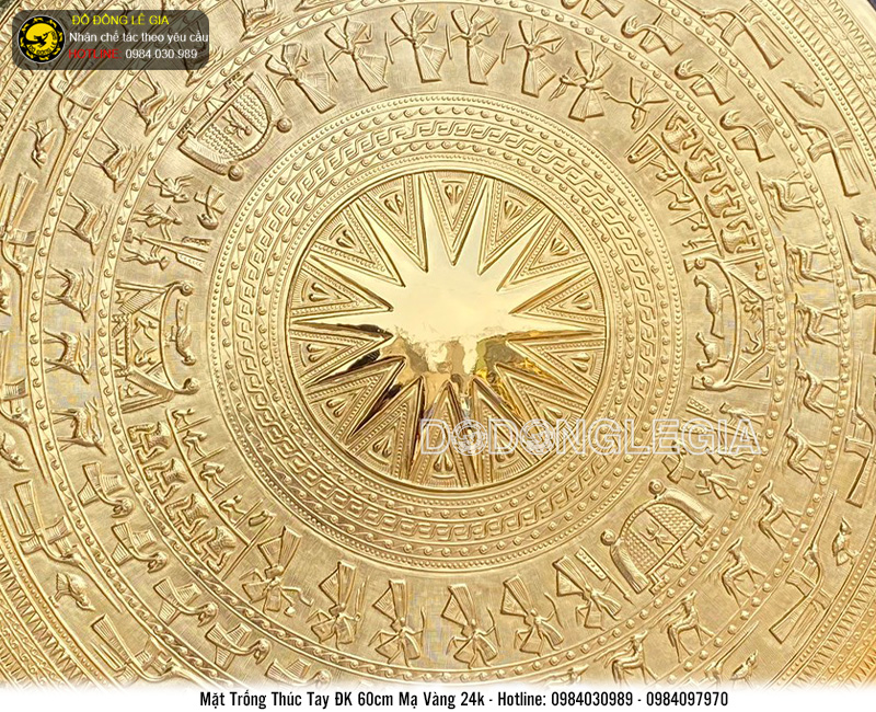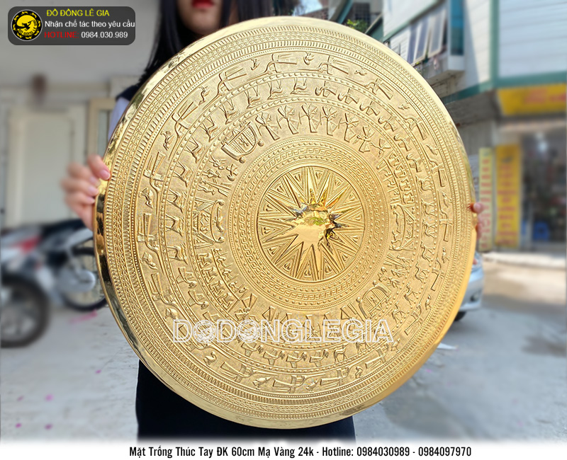 Mặt trống được thúc tay với chất liệu đồng với tấm đồng có độ dày tiêu chuẩn từ 0,8 đến 1 ly, mạ vàng 24k cao cấp, vừa tạo độ bóng sang trọng vừa giúp nâng cao độ bền của sản phẩm theo thời gian. Các chi tiết trên mặt trống được khắc hoạ tinh xảo, sinh động cho thấy sự tỉ mỉ và độ lành nghề và đôi bàn tay tài hoa của những nghệ nhân của Lê Gia