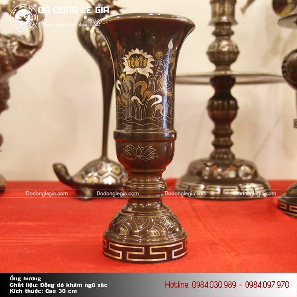 Ống hương khảm ngũ sắc với sự hoà quyện các gam màu trắng, vàng, nâu đỏ tạo lên nét đẹp tinh tế, thiêng liêng. Sản phẩm sử dụng để đựng hương nhang trên các bàn thờ thần linh, tổ tiên. Sự xuất hiện của hình ảnh những bông hoa sen trên ống hương thể hướng con người tới sự thanh cao, thoát tục, đem lại may mắn cho gia đình.