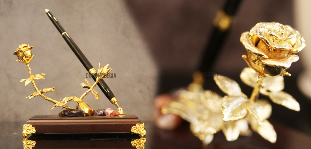 Quà tặng Đế bút hoa hồng mạ vàng 24k thích hợp dành tặng cho các sếp nữ đặt trên bàn làm việc