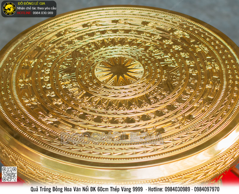 Quả Trống D60 dát vàng 9999 - được đúc thủ công từ đồng đỏ tinh khiết. Phía bên ngoài được dát vàng 9999 cao cấp. Do đó luôn đảm bảo được độ bền và ưu thế vượt trội so với các sản phẩm khác trên thị trường. Nhìn từ xa cũng có thể thấy sản phẩm thể hiện được sự sang trọng và nổi bật theo thời gian.