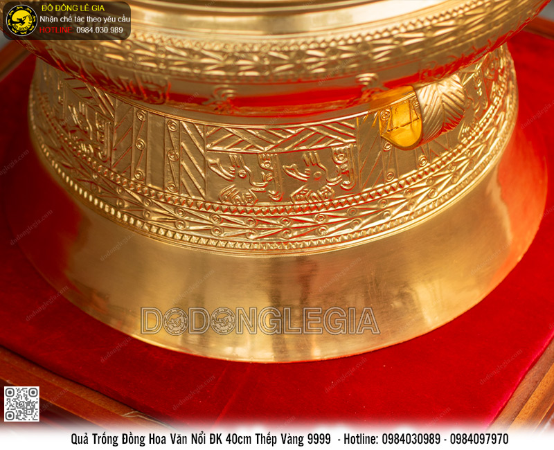 Quả Trống Đồng Hoa Văn Nổi ĐK 40cm thếp vàng 9999 có kích thước vừa phải. Phù hợp để trưng bày trong phòng làm việc hoặc đặt trên các kệ gỗ, tủ gỗ, tủ kính. Tại phòng khách, phòng hội nghị hoặc các trung tâm sự kiện. Trên thực tế chúng được xem là vật phẩm rất ý nghĩa để dành tặng đối tác khách hàng. Hoặc làm quà tặng cao cấp trong những dịp lễ tết, các sự kiện truyền thông, giao lưu văn hoá...Từ đó góp phần quảng bá nét đẹp và hình ảnh tốt đẹp của người dân Việt Nam.
