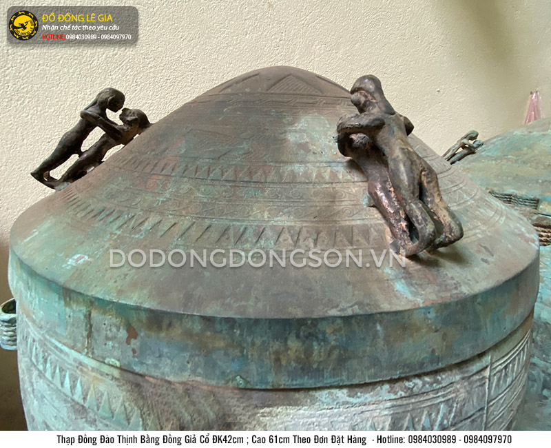 Xưởng Đúc Đồng Lê Gia nhận được đơn đặt hàng của khách hàng chế tác mô phỏng lại phiên bản gốc của thạp đồng Đào Thịnh cổ. Sau thời gian nghiên cứu hoa văn, hình dáng của thạp đồng cổ, chúng tôi đã tiến hành chế tác mô phỏng phiên bản chính. Thạp đồng Đào Thịnh của Lê Gia sau khi đúc bằng đồng đỏ được tạo màu xanh giả cổ, được đánh giá là giống phiên bản chính đến 95%.